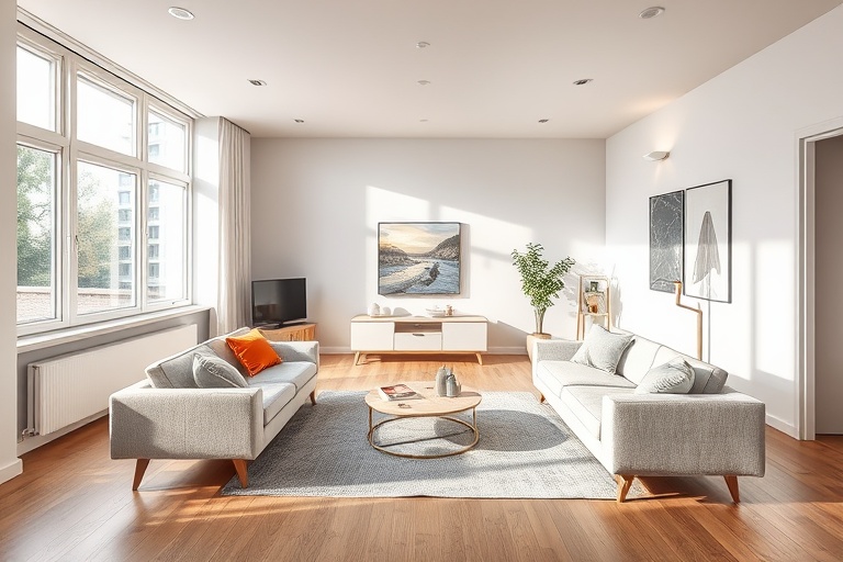 The fully equipped kitchen includes high-quality appliances, including a dishwasher, refrigerator, oven, and induction cooktop. The living room offers plenty of space for both dining and relaxing, with a comfortable sofa and a dining table that seats four.